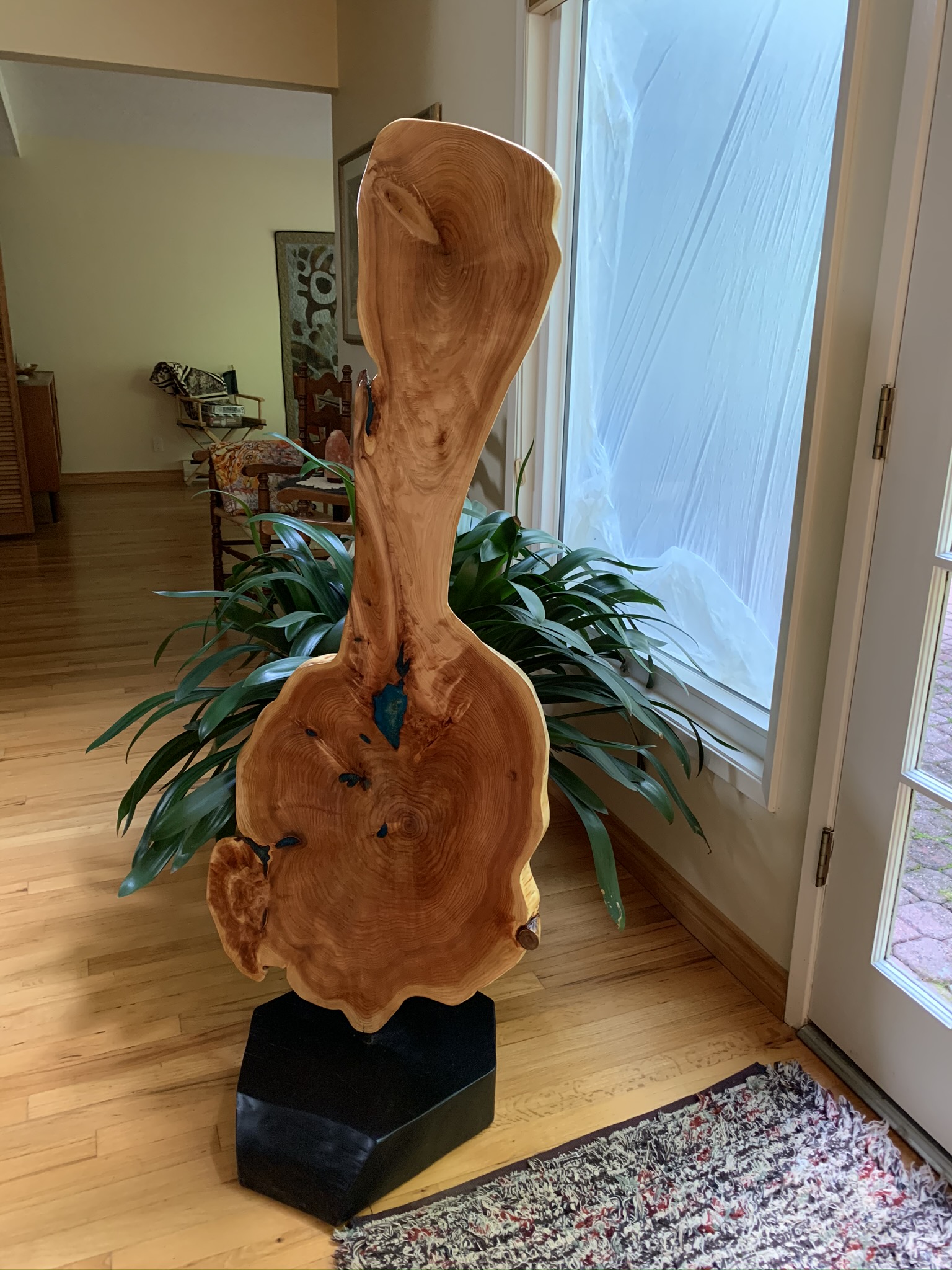 It is Red cedar finished with several coats of gloss varathane. Coloured epoxy was used to fill some cracks and it is mounted on a piece of painted Douglas fir.